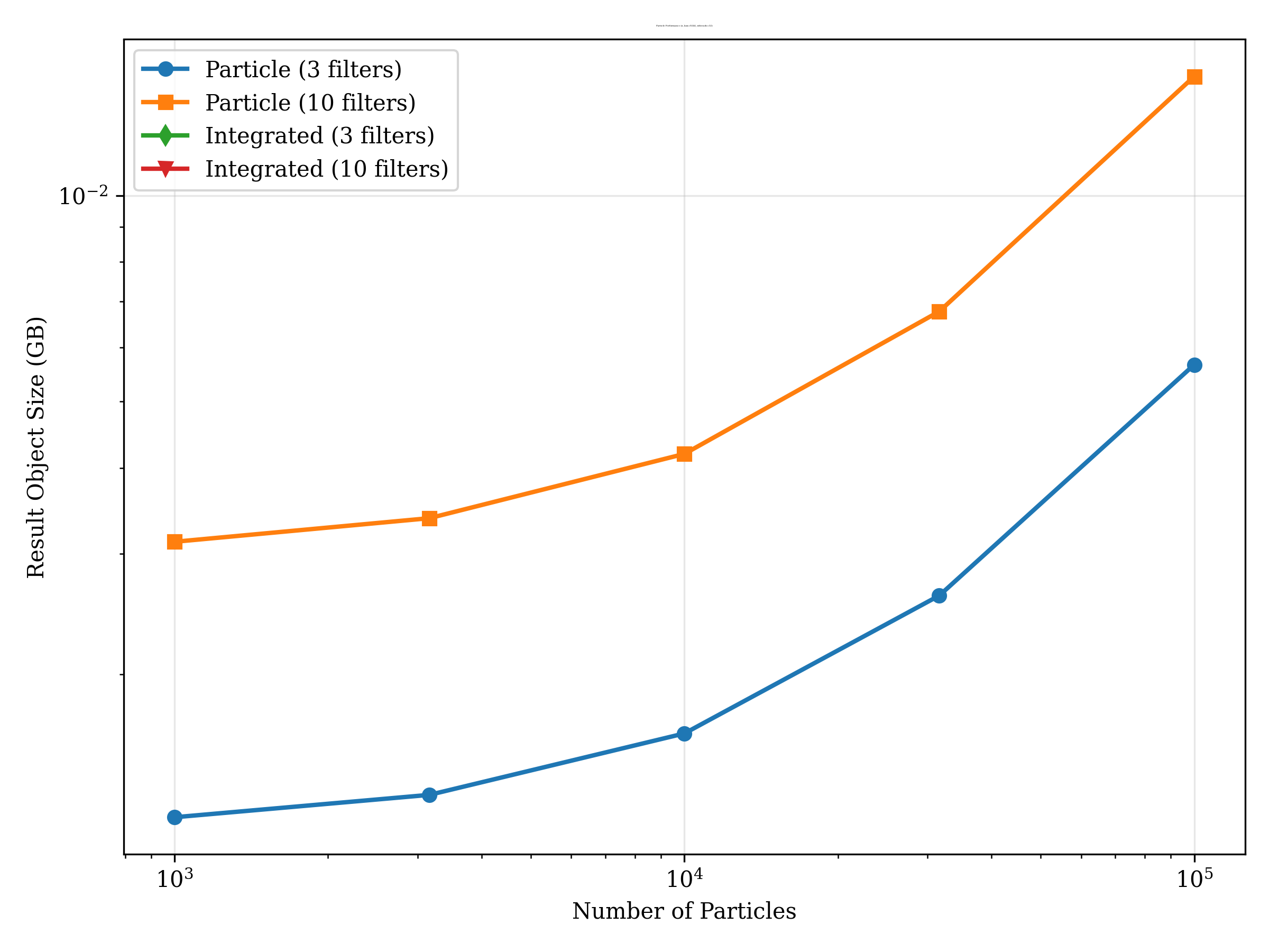 These plots show the memory size of the generated spectra and photometry objects as a function of the number of particles.